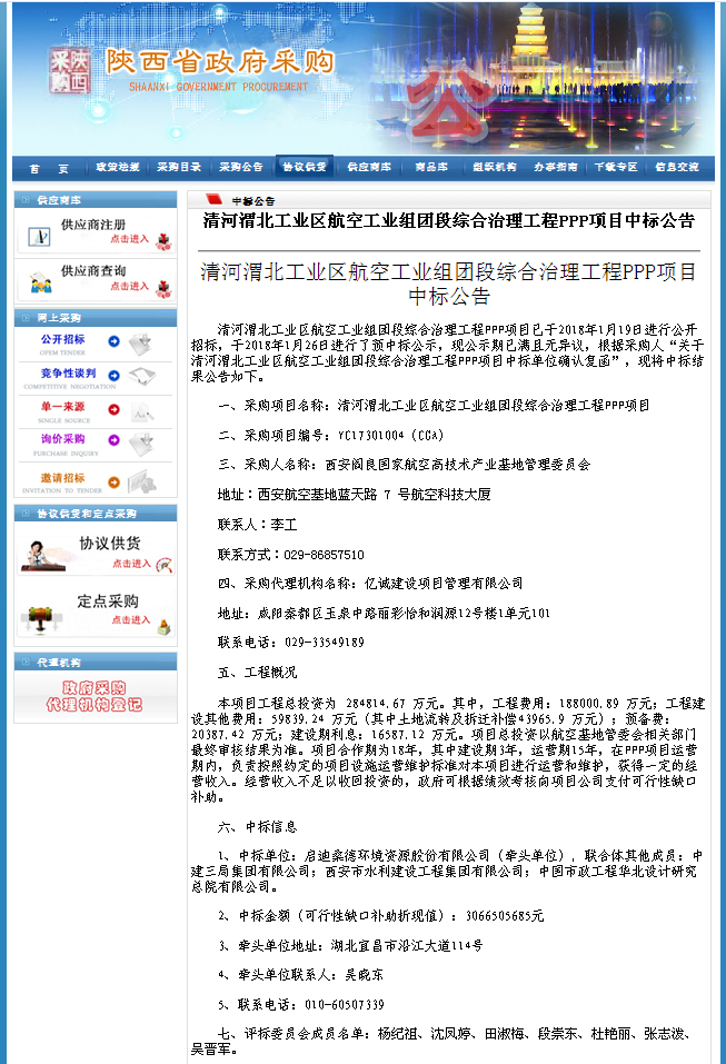 清河渭北工業(yè)區(qū)航空工業(yè)組團(tuán)段綜合治理PPP項目于2018年1月19日進(jìn)行了公開招標(biāo),經(jīng)評標(biāo)委員會評審,推薦以啟迪桑德環(huán)境資源股份有限公司牽頭,與中建三局集團(tuán)有限公司、西安市水利建設(shè)工程集團(tuán)有限公司、中國市政工程華北設(shè)計研究總院有限公司組成的聯(lián)合體中標(biāo)。